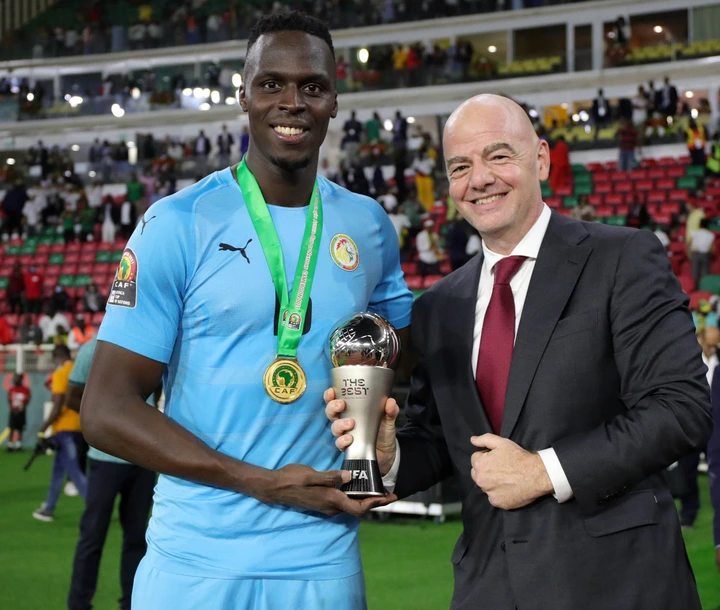 “FIFA President Gianni Infantino and Secretary General @fatma_samoura presented Edouard Mendy with his The Best FIFA Men’s Goalkeeper 🏆, just minutes after #TeamSenegal won a historic maiden #AFCON2021 title. 👏”