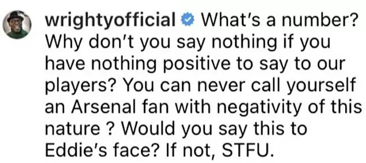‘You can never call yourself an Arsenal fan with negativity of this nature. Would you say this to Eddie’s face? If not, STFU [shut the f*** up].’