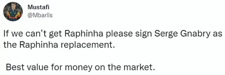 ‘If we can’t get Raphinha please sign Serge Gnabry as the Raphinha replacement. Best value for money on the market.’