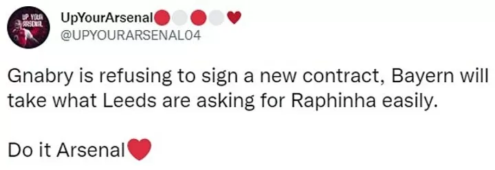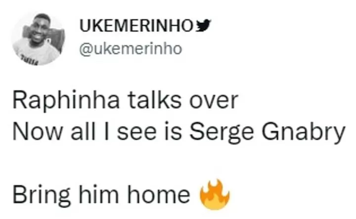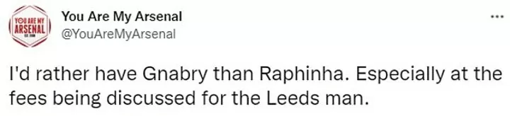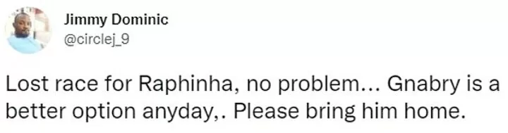 One Twitter user echoed the thoughts of many Arsenal fans regarding both Raphinha and Gnabry.