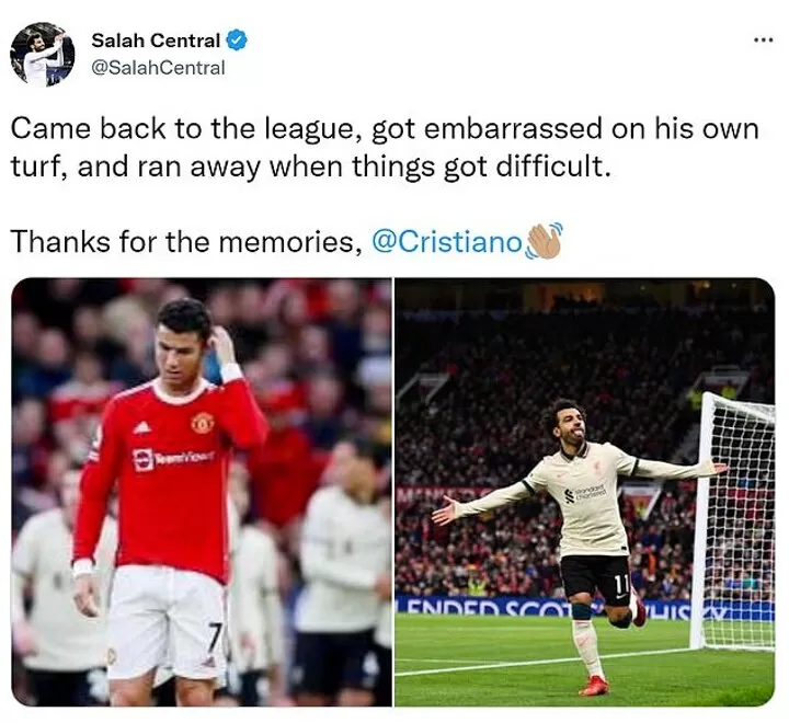 A fan account of Liverpool striker Mo Salah said of Ronaldo: ‘Came back to the league, got embarrassed on his own turf, and ran away when things got difficult.’ They also brutally added ‘Thanks for the memories’ before tagging the Portuguese star, who becomes one of a rare few to star at a World Cup without a club assignment.