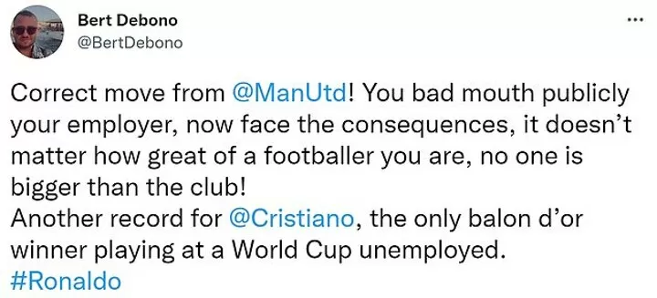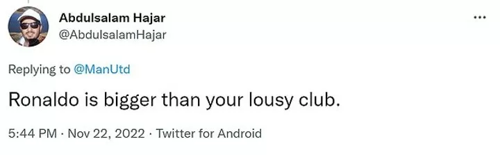 One responded to Manchester United’s official tweet on the matter, saying: ‘Ronaldo is bigger than your lousy club.’