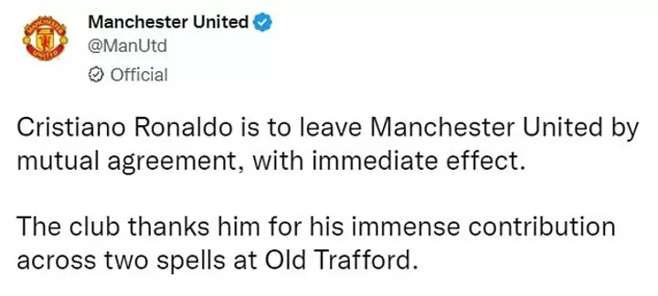 United announced that troublemaker Ronaldo would leave the 13-time Premier League champions following his highly-critical interview in which he slated manager Erik ten Hag, teammates, and the club owners.