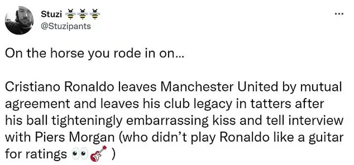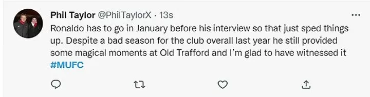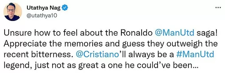 Someone else shared their conflicted feelings on Ronaldo’s departure, feeling his long-term success for United outweighs the bitter feud in recent times. They noted: ‘@Cristiano’ll always be a #ManUtd legend, just not as great a one he could’ve been…’