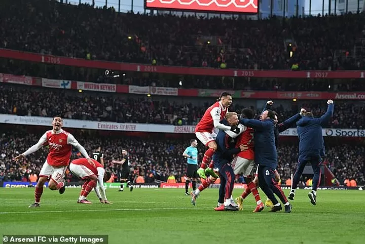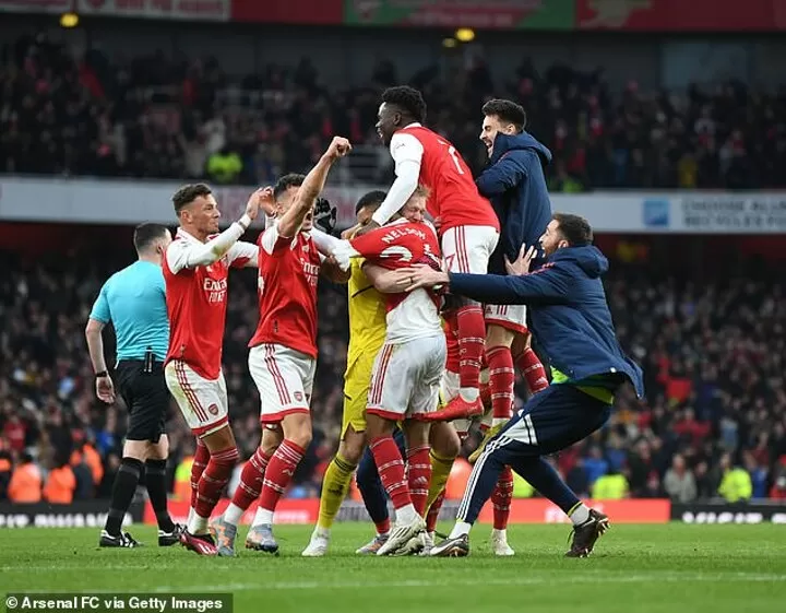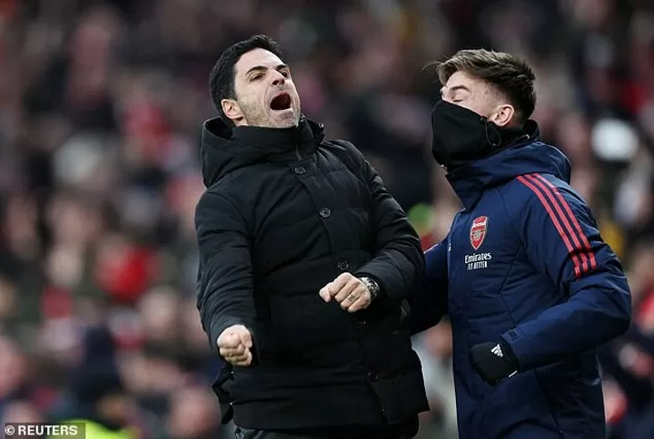 Gunners manager Mikel Arteta ran down the touchline and hugged one of his players before giving a double fist pump to the celebrating Arsenal fans, all the while appearing not to step on to the pitch.