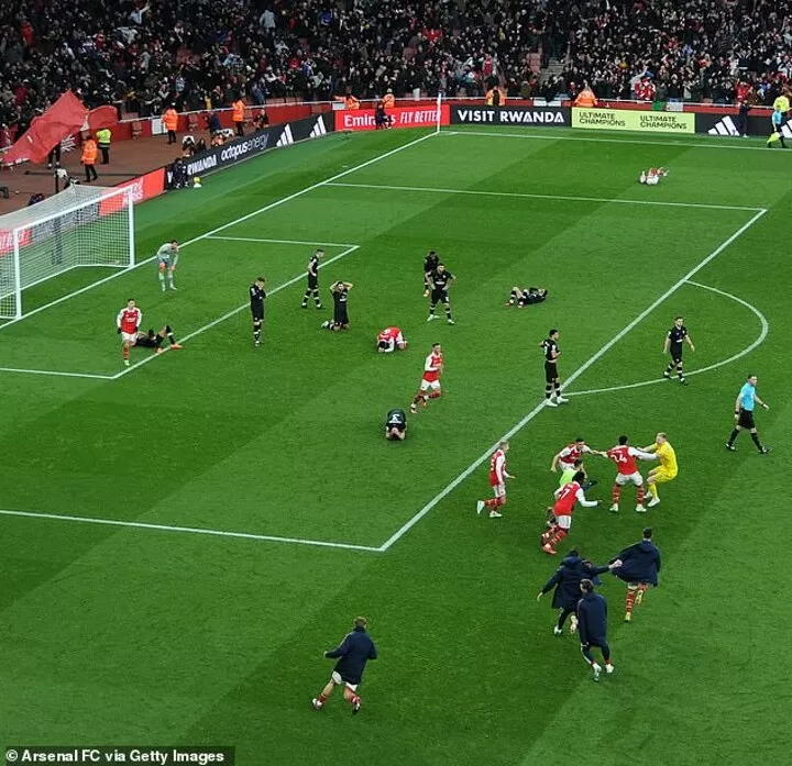 A group of Arsenal staff members simultaneously flooded the pitch to celebrate with the players, unable to control themselves after watching the last-gasp winner.