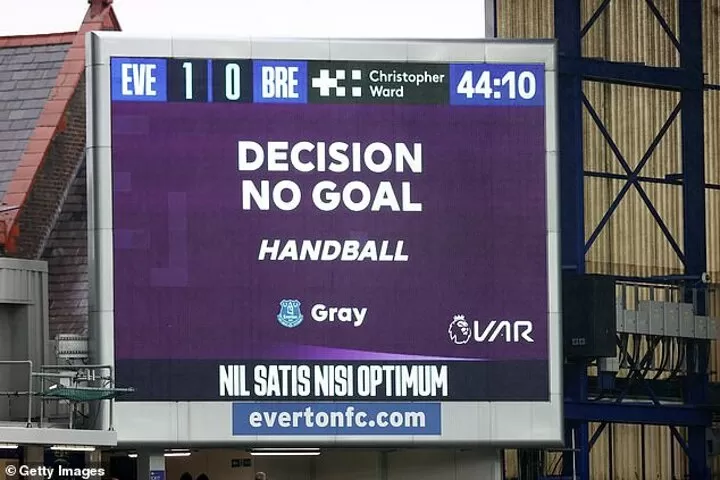 Ethan Pinnock’s clearance had hit him at close range and rolled in but VAR ruled it had connected with the Everton player’s upper arm rather than his shoulder.